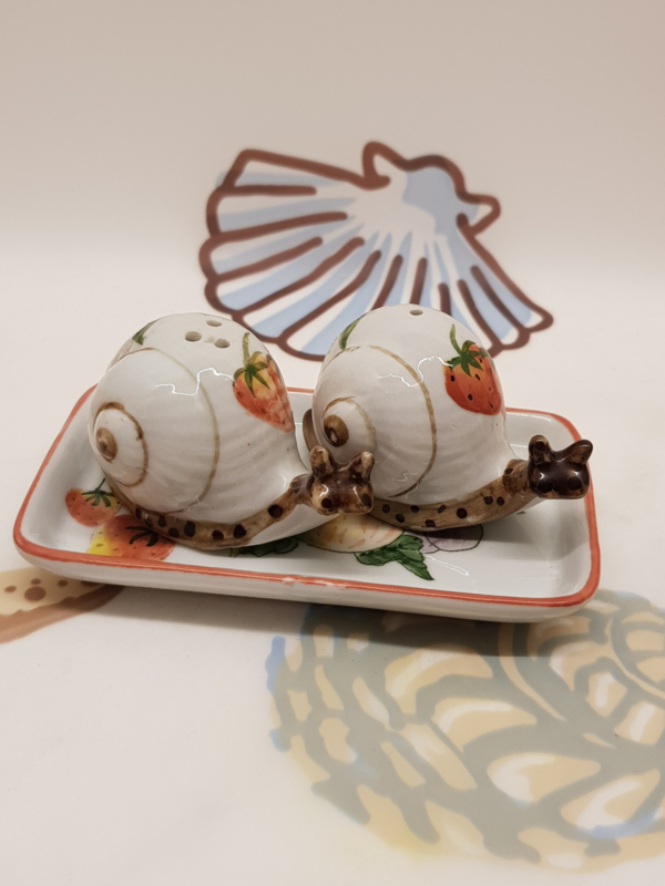 Schnecken auf einem Tablett als Salz- und PfefferstreuerSchönes Keramik-Schnecken-Set als Salz- und Pfefferstreuer, mit Schale, 11 x 5 cm (Höhe).