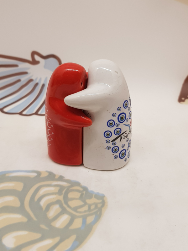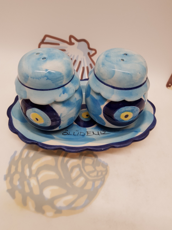 Salz- und Pfefferstreuer als Souvenir aus der TürkeiSchönes Souvenir aus der Türkei, dreiteiliges Porzellan aus Ölüdeniz, kleine Absplitterung am Boden der Schale (siehe letztes Foto), 16 x 10,5 x 9 cm.