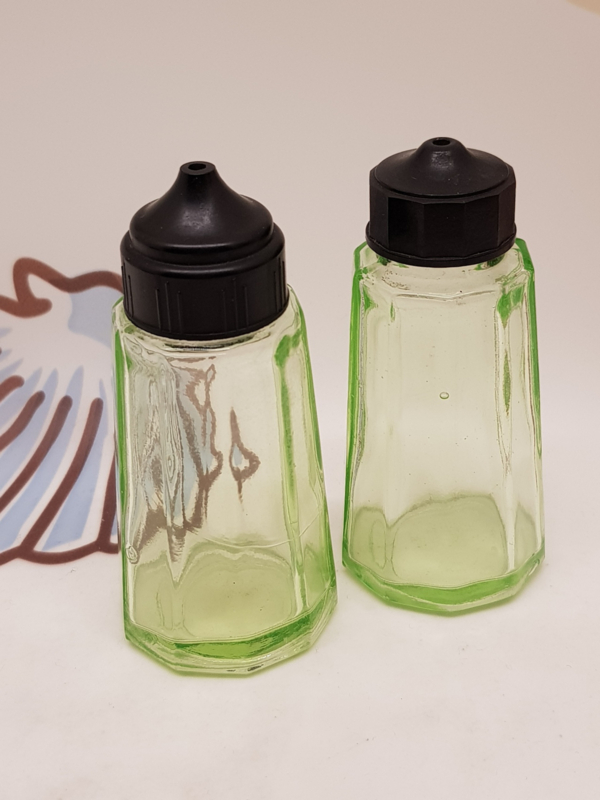 Salz- und Pfefferstreuer aus grünem UranAntike Salz- und Pfefferstreuer, urangrünes Glas mit Kunststoffkappe (Bakelit?), 7 cm hoch.