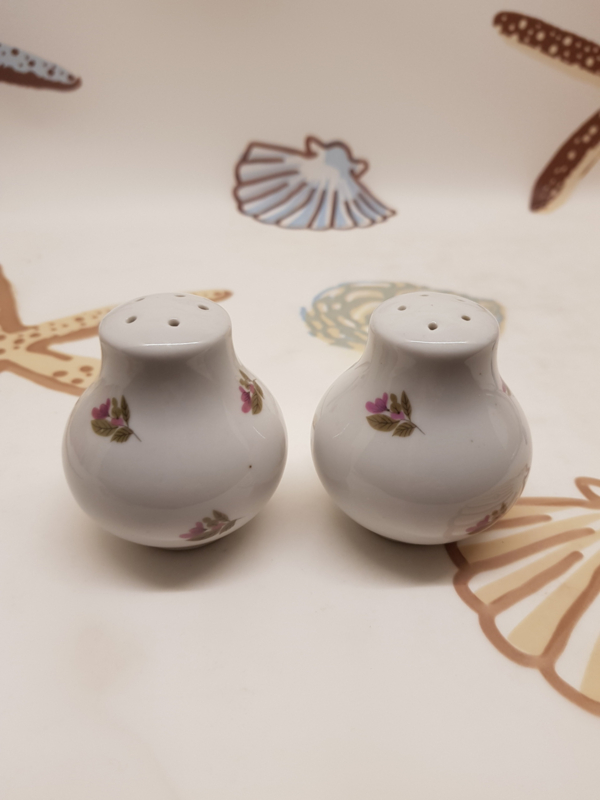 Salz- und Pfefferstreuervasen mit Blumen aus den 1960er JahrenZwei sehr alte Salz- und Pfefferstreuer aus Porzellan mit einer schönen Blume auf der Vorderseite, 8 cm hoch.