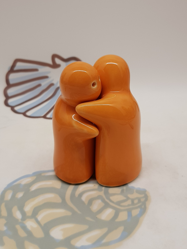 Salz- und Pfefferstreuer begrüßen Menschen OrangeWunderschöne Salz- und Pfefferstreuer aus Porzellan in Form einer orangefarbenen Grußkarte.