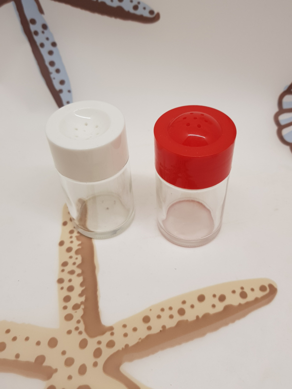 Vintage rot-weiße Salz- und PfefferstreuerSchöne Vintage-Salz- und Pfefferstreuer aus Glas mit Kunststoffkappe, 8 cm hoch, Durchmesser 4 cm.