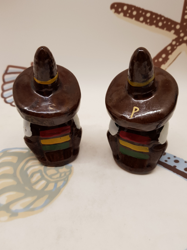 Salz und Pfeffer Schlafende MexikanerVintage Pfeffer- und Salzset mit der Darstellung zweier schlafender Mexikaner, 10,5 cm hoch.