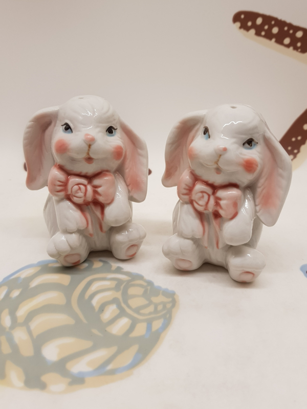Salz- und Pfefferstreuer mit HasenmotivHübsche Salz- und Pfefferstreuer aus Porzellan in Form von zwei grüßenden Hasen, 7,5 cm hoch.