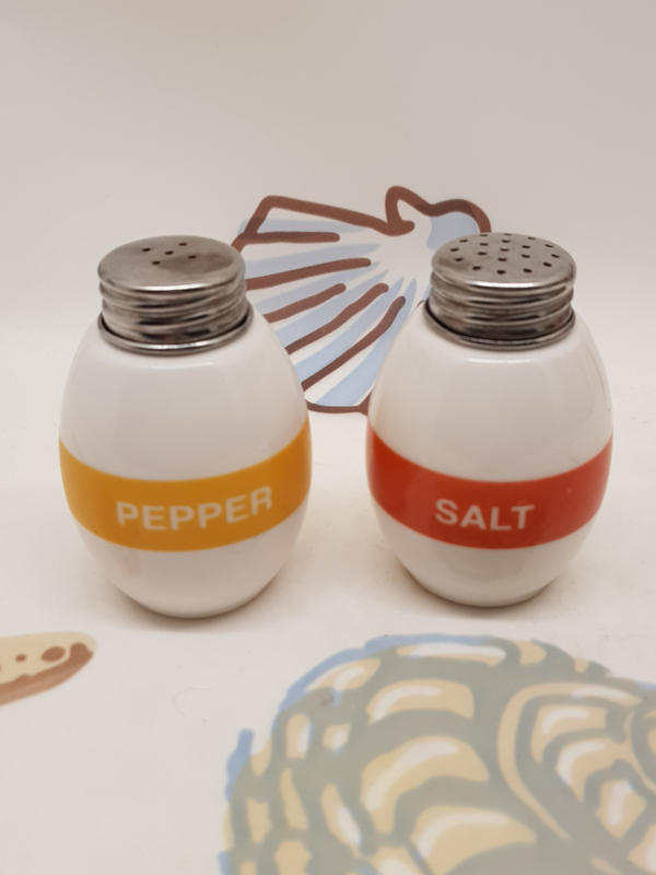 Salz- und Pfefferstreuer aus den 70er JahrenSalz- und Pfefferstreuer aus Porzellan aus den 1970er Jahren, 7,5 x 4,5 x 3 cm.