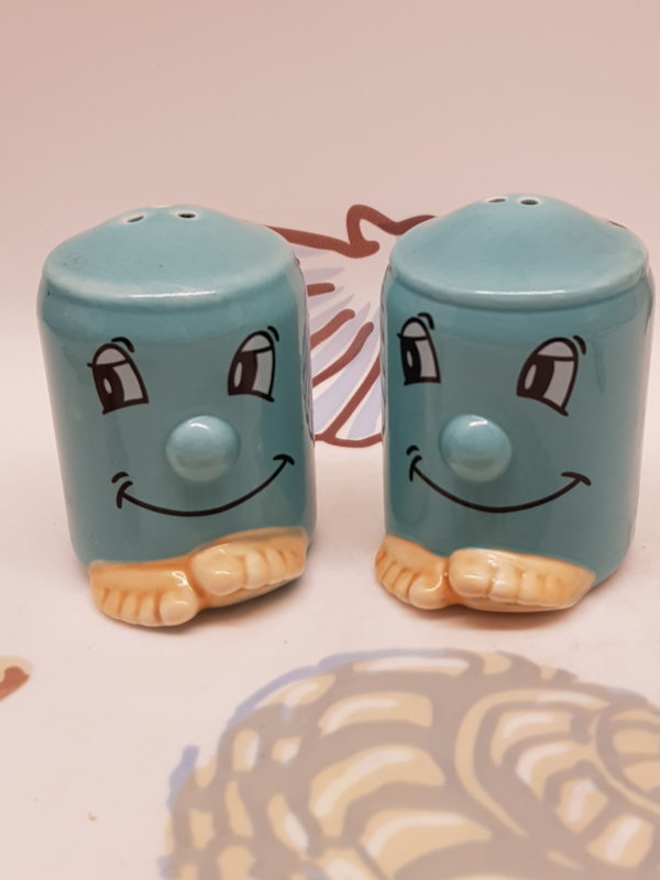 Salz und Pfeffer Vintage-GesichterNiedliche Gesichter aus den 70er Jahren als Salz- und Pfefferstreuer, in gutem Zustand, 7 cm hoch.