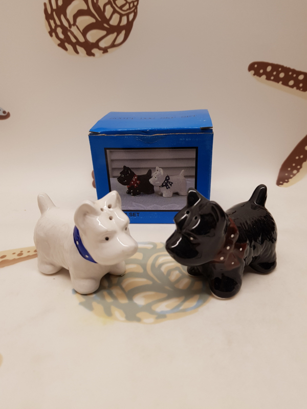 Kleine Hunde als Salz- und PfefferstreuerNiedliche kleine Hunde in Schwarz-Weiß, neu in Originalverpackung, 5x8cm.
