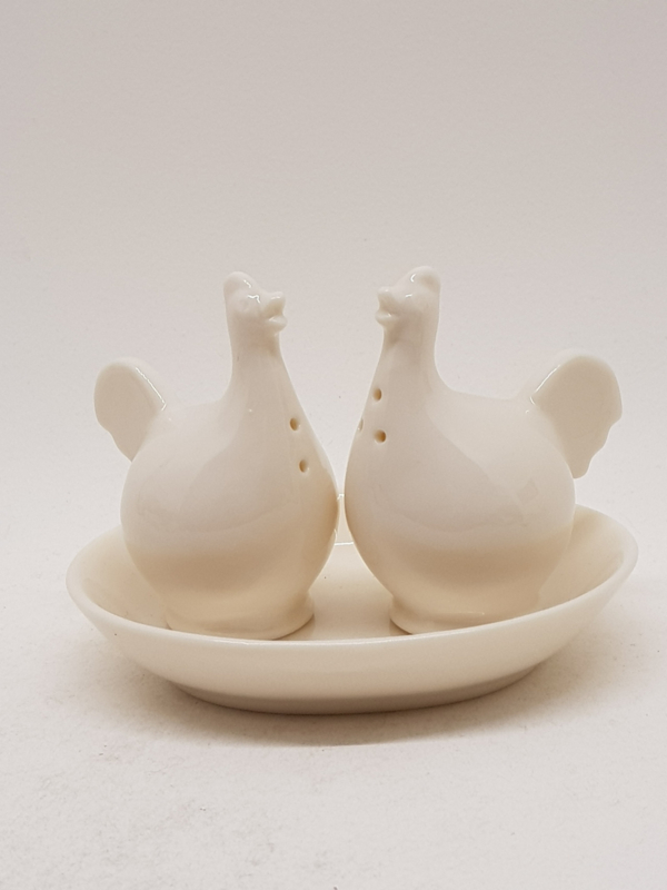 Cremefarbene Mini-Hühnchen-Salz- und PfefferstreuerKleine Porzellanhühner als Salz- und Pfefferstreuer, Höhe 7,5 cm.