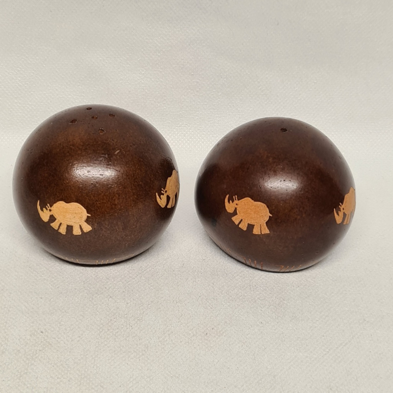 Holzkugeln mit Salz- und Pfefferstreuern aus Simbabwe2 Holzkugeln als Salz und Pfeffer mit dem Bild eines Nashorns, als Souvenirs aus Zinbabwe, 8 cm, H6 cm (1 gemessen).