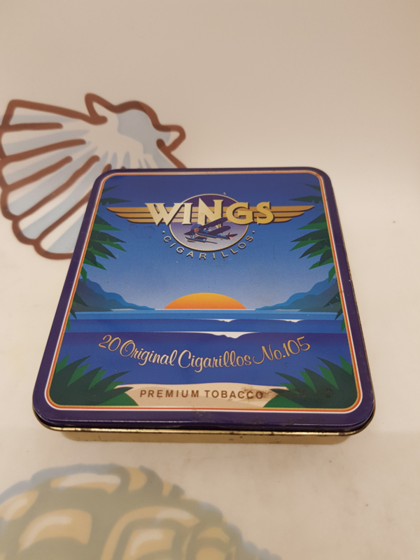 Wings 20 Zigarrendose Nr. 105aus der Willem II Sigarenfabrieke nv, die Zigarrendose Wings Nr. 105, der Preis in den 80er/90er Jahren 7,50 fl. 7,50, 10x5x1,8h.