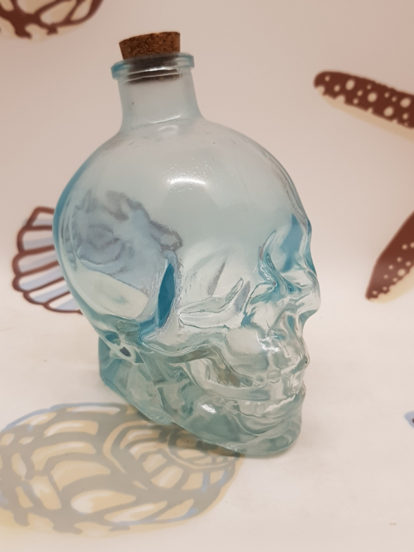 Totenkopf aus blauem GlasWunderschöner blauer Totenkopf aus dickem Glas mit Stöpsel, ideal zum Servieren von Getränken.