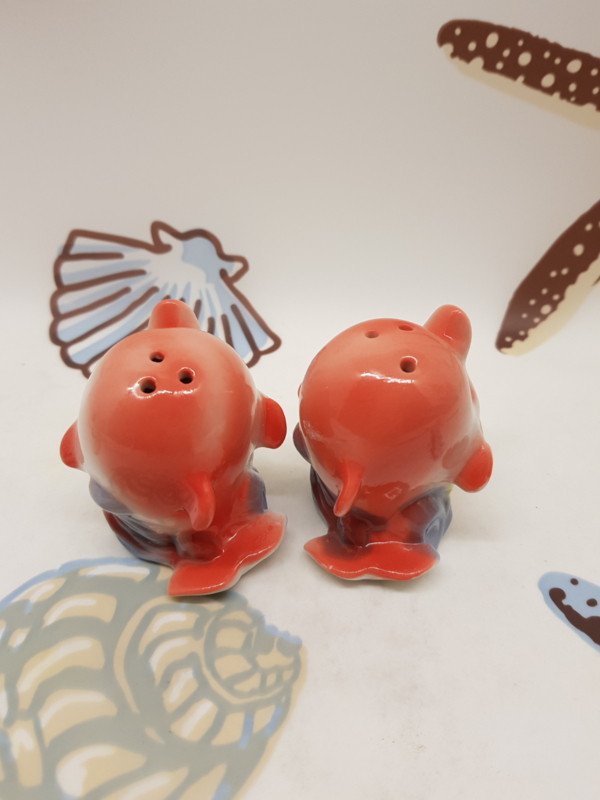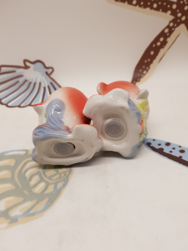 2 cute character dolphins as salt and pepper shakers, 7 cm high.