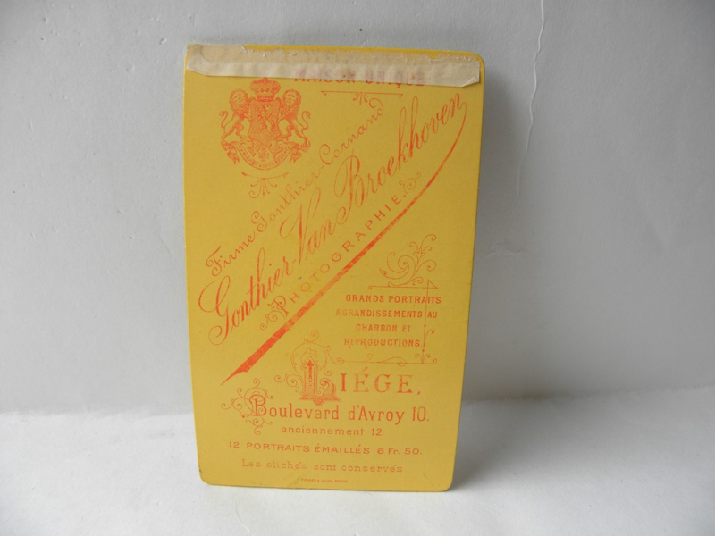 Antique portrait photograph with a kind of thickening on cardboard by Gonthier van Broekhoven from Liege 1860-1910, 6.4x10.5cm.